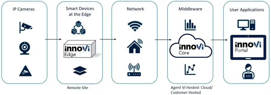 Sensores (cámaras), Dispositivos inteligentes en el borde – innoVi EdgeTM, Red, Middleware- innoVi CoreTM, usando aplicaciones frontales – innoVi PortalTM o aplicaciones de terceros