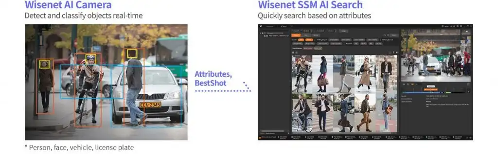 A través de la serie Wisenet P/X, Hanwha Techwin incluye funciones de IA, tales como detección de personas, vehículos, reconocimiento de placas; así como poder diferencia atributos en personas tales como color de la ropa, si la persona lleva gafas, edad, género y en el caso de vehículos, tipo de vehículo , color y placa.